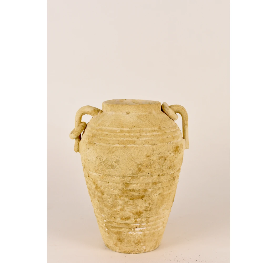 Designed to resemble traditional archaeological pottery, this beige rustic ceramic urn adds timeless character and earthy beauty to any space. The hand-applied aged texture, subtle distressing, and engraved band pattern give it an authentic vintage look—perfect for interior styling that values warmth, originality, and natural charm.
