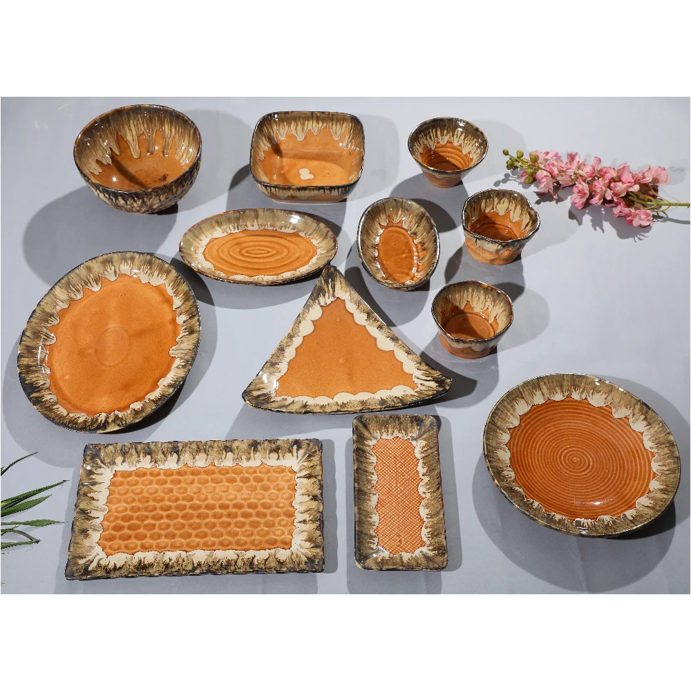 A handcrafted ceramic dinnerware collection featuring rich amber and terracotta tones with organic textures, inspired by earth, clay, and natural warmth.