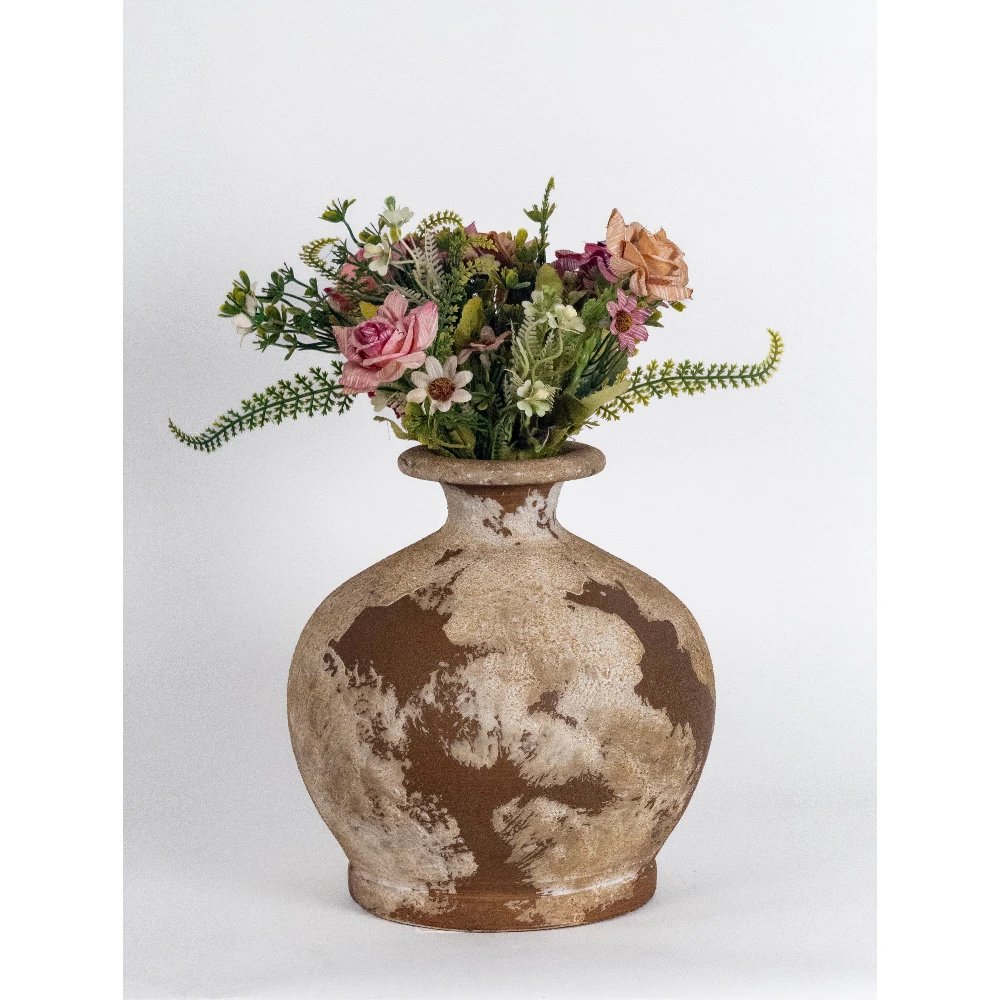 The textured surface and hand-finished detailing give it an authentic antique appeal, making it perfect for dried florals, artificial arrangements, or standalone statement styling. Its neutral tones blend seamlessly with rustic, farmhouse, bohemian, Mediterranean, and heritage-inspired interiors.