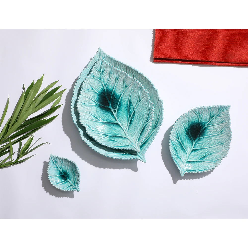 The Aqua Vein Leaf Handcrafted Ceramic Serveware collection is inspired by the delicate structure and natural beauty of foliage. Each piece is carefully hand-shaped by skilled artisans to highlight fine leaf veins, softly scalloped edges, and a sculptural organic form.