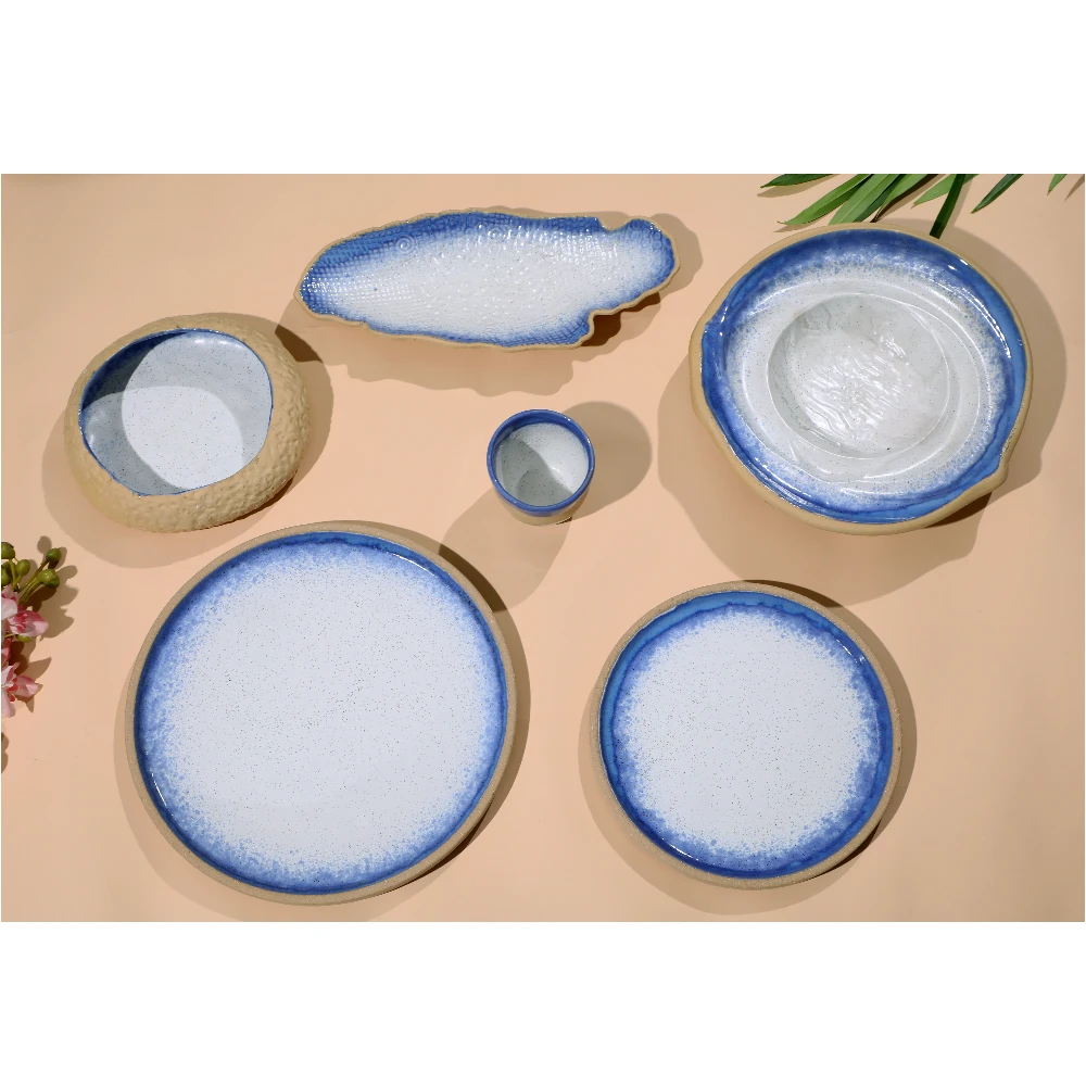 The Azure Drift Serveware Collection draws inspiration from tranquil shorelines and the gentle movement of water. Each piece is thoughtfully handcrafted in premium ceramic, finished with a soft white glaze that flows organically into a hand-brushed blue rim—creating a calm yet striking visual balance.