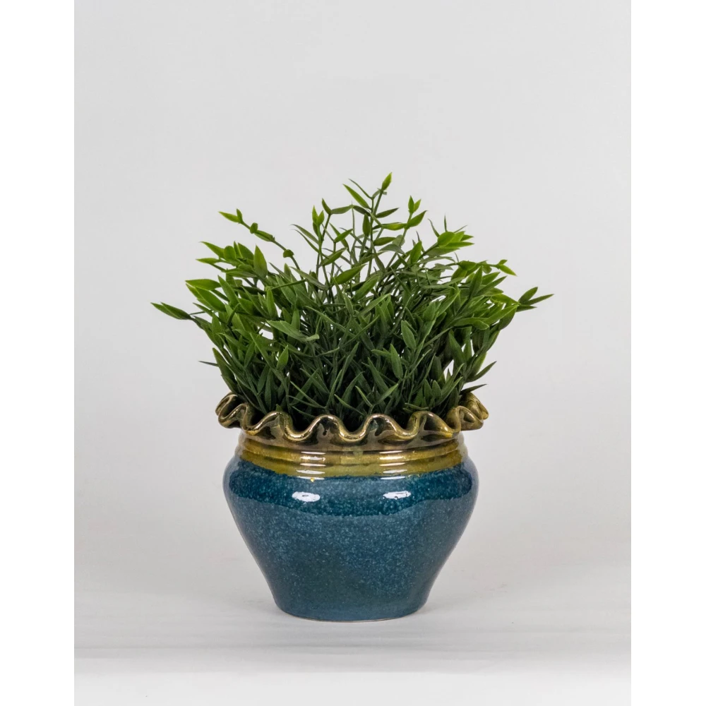 A handcrafted ceramic planter with a glossy blue glaze and an elegant ruffled rim highlighted in earthy tones—perfect for refined indoor décor.
