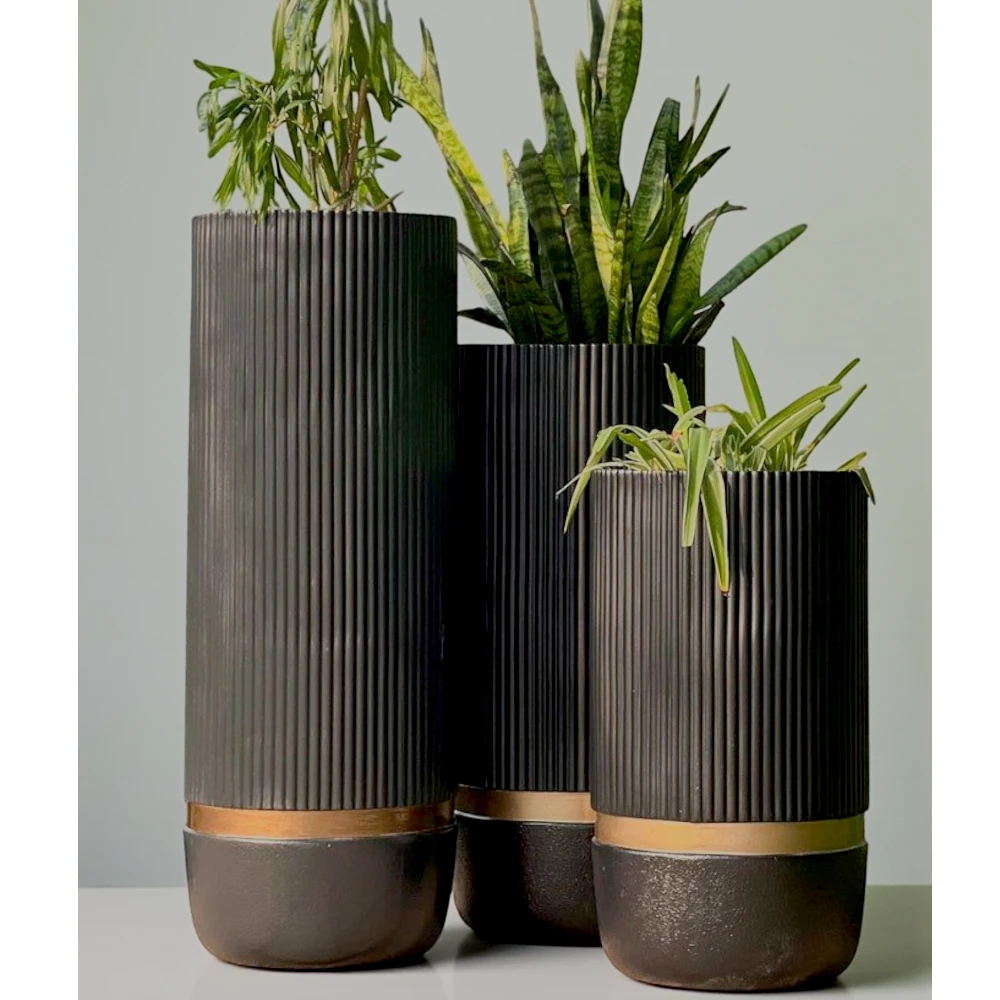 Upgrade your green corners with our Black Ribbed Tall Planter Set, designed to add luxury and depth to any interior or exterior space. The matte ribbed finish paired with a golden metallic base creates a bold designer look, making these planters a statement piece wherever placed.