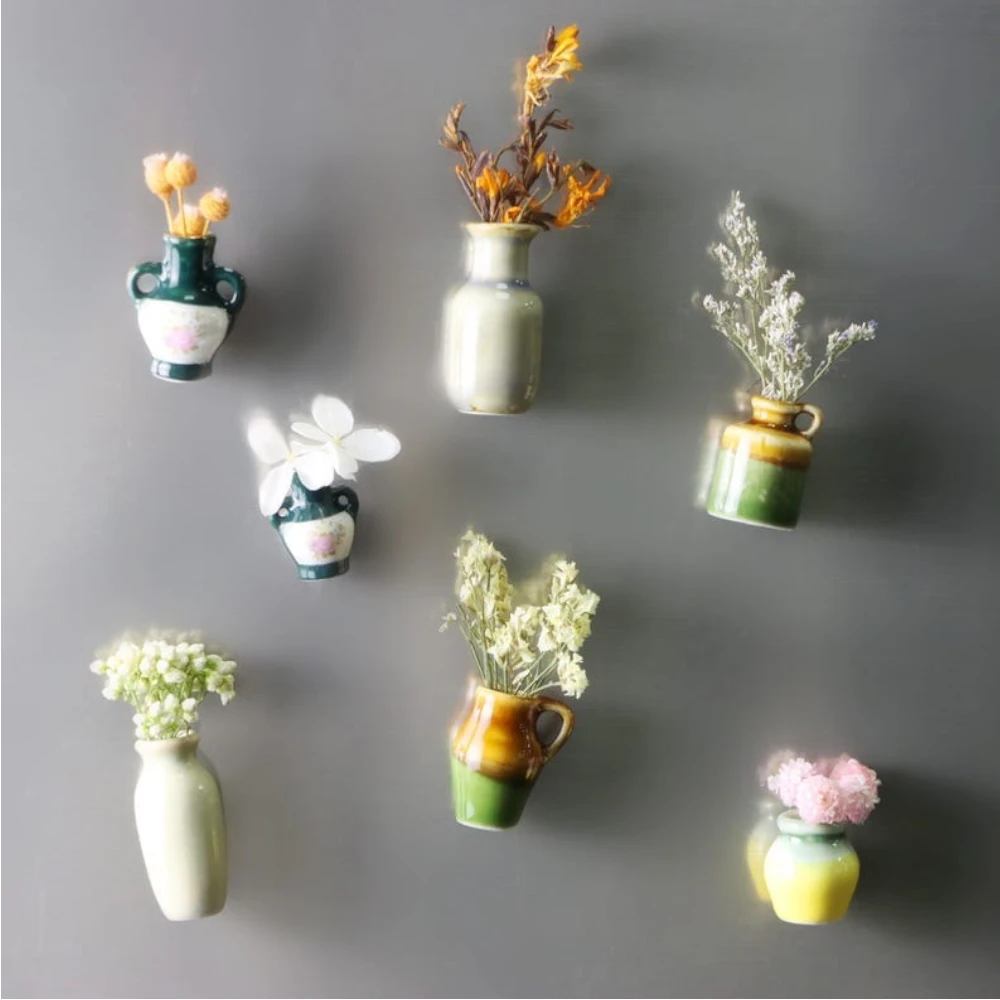 Elegant mini ceramic vase-shaped fridge magnets with floral detailing—perfect for adding a subtle vintage charm to your refrigerator or workspace.