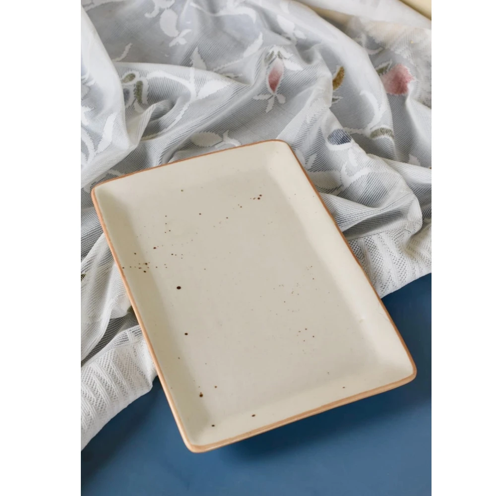 The ClayMist Recto Speckle Platter blends minimalist elegance with artisanal craftsmanship. Designed in a spacious rectangular form, this ceramic platter features a smooth ivory glaze highlighted by organic speckles and a hand-brushed terracotta-toned rim. The clean, modern edges paired with the rustic texture create a beautifully balanced look suitable for any dining setup.