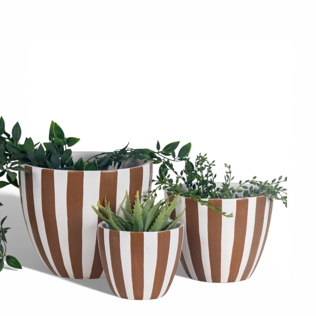 The Cocoa Stripe Ceramic Planter Set brings contemporary elegance with a warm, earthy touch. Designed with bold vertical brown stripes on a crisp white background, this coordinated set of three planters creates a clean yet eye-catching statement in any space.
