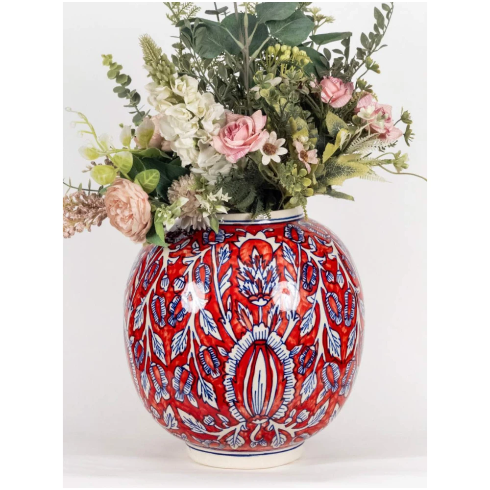 The Crimson Heritage Hand-Painted Ceramic Vase is a powerful expression of traditional craftsmanship and vibrant design. Handcrafted and meticulously painted, this vase showcases detailed floral and ornamental patterns in deep red, accented with ivory and indigo highlights, creating a visually captivating piece.