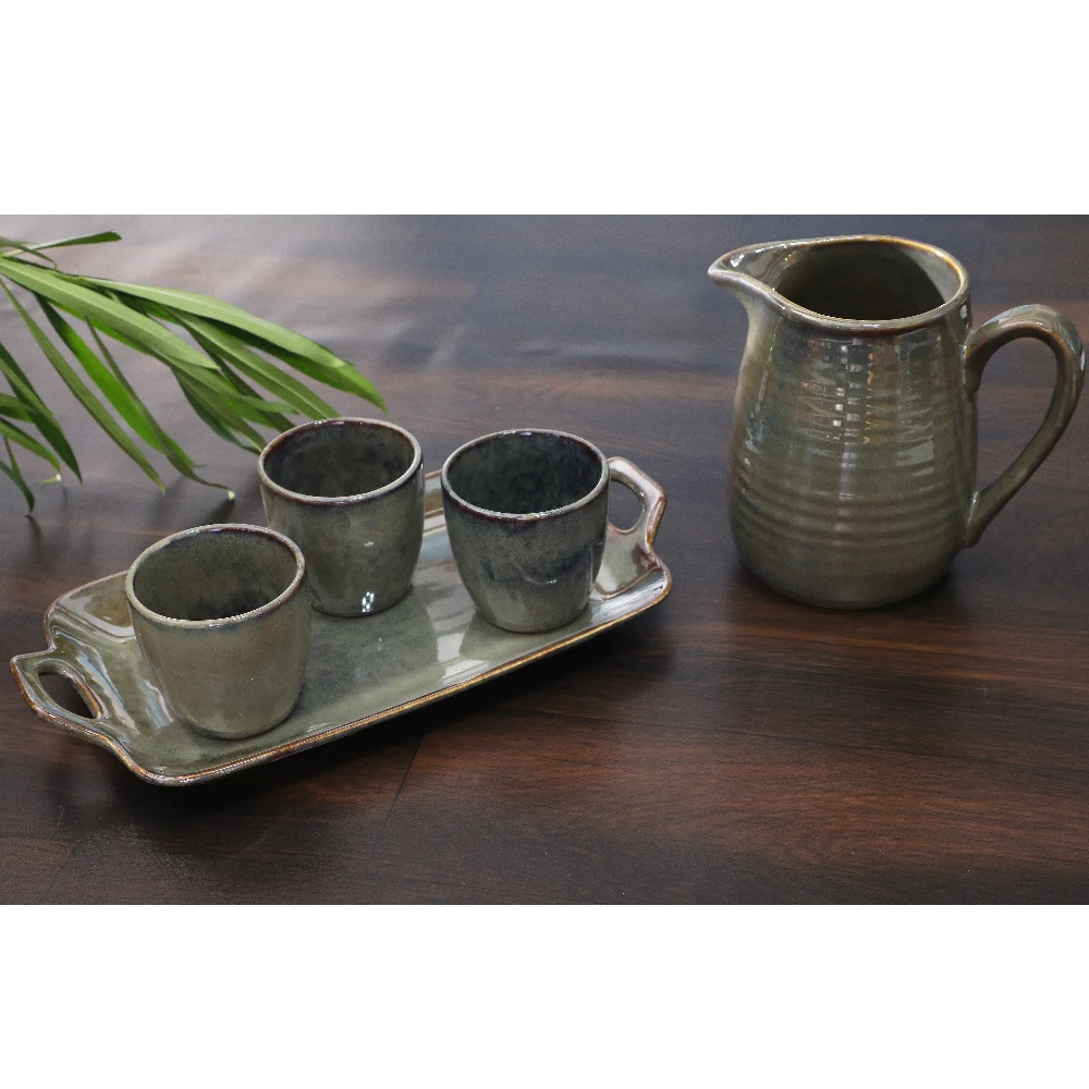 The set includes a generously sized ribbed jug with a smooth pouring spout, three compact cups designed for comfortable grip, and a rectangular serving tray with raised handles for easy carrying. The coordinated glaze and soft contours create a cohesive, refined look suitable for both casual and premium settings.