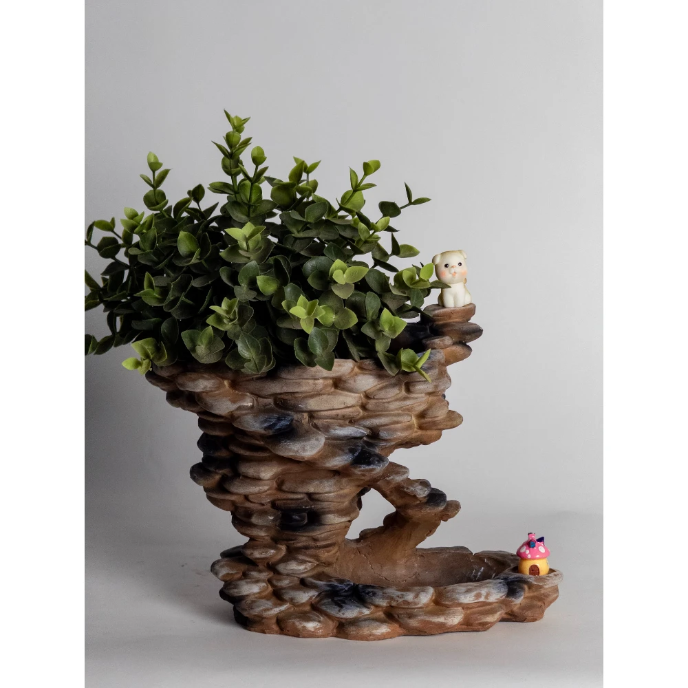 The upper section holds lush greenery, while the lower curved ledge features tiny decorative accents — adding charm and character. The detailed stone layering gives a realistic cliff-like appearance, making it ideal for fantasy-themed décor, kids’ rooms, and creative interiors.