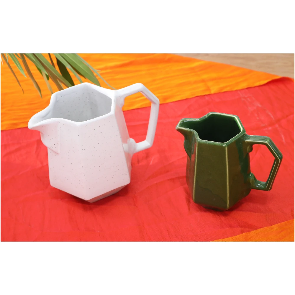 Handcrafted with precision, the pourer features a cleanly cut spout for controlled, drip-free pouring. Available in soft speckled ivory and deep olive green glaze finishes, it complements modern dining spaces, cafés, and boutique hospitality settings.
