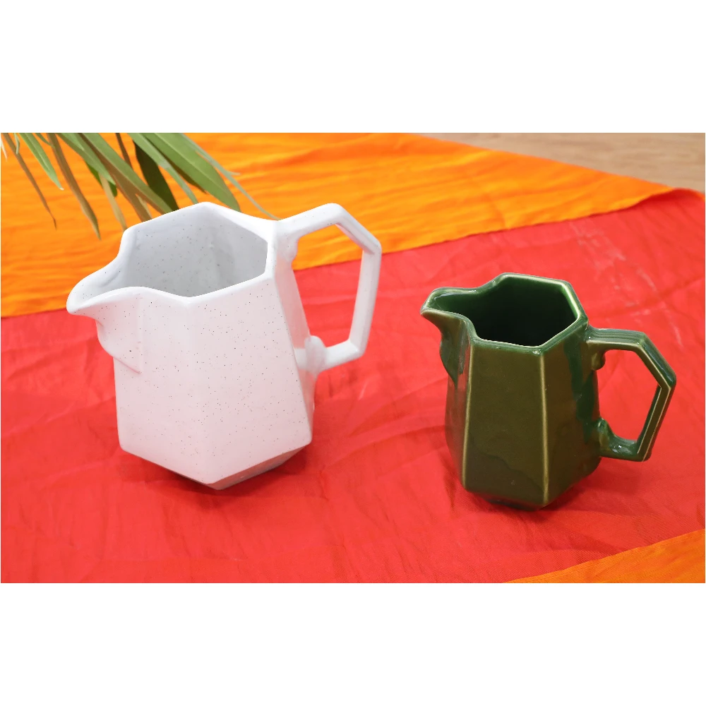 A modern ceramic pouring jug set with sharp faceted geometry, finished in speckled white and glossy olive green glazes. Designed for precise pouring and standout table styling.