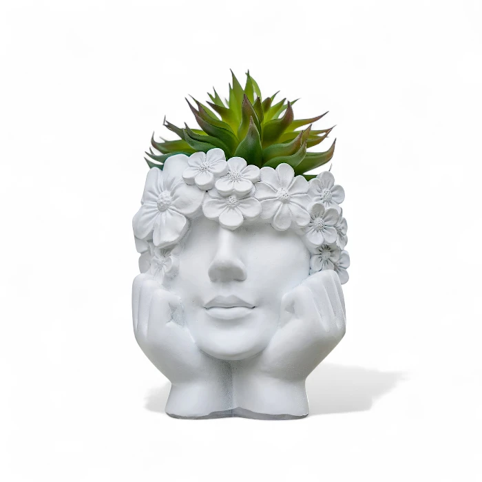 Handcrafted in elegant white ceramic, this planter features a calm, sculpted face adorned with a delicate crown of flowers — symbolizing peace, beauty, and creativity. 🌸