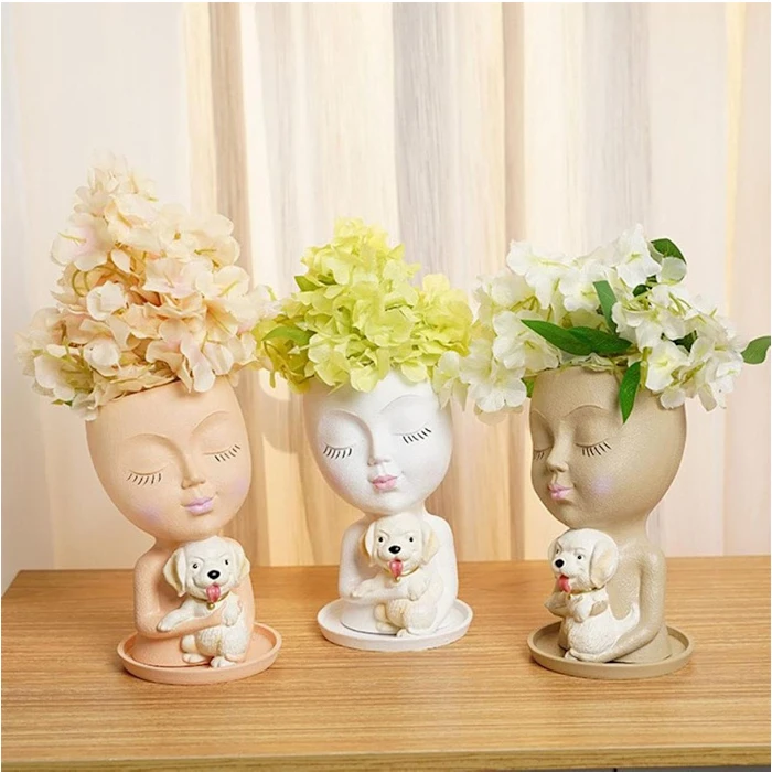 Each planter features a serene girl figure holding a playful puppy, beautifully sculpted and hand-painted by our skilled artisans.