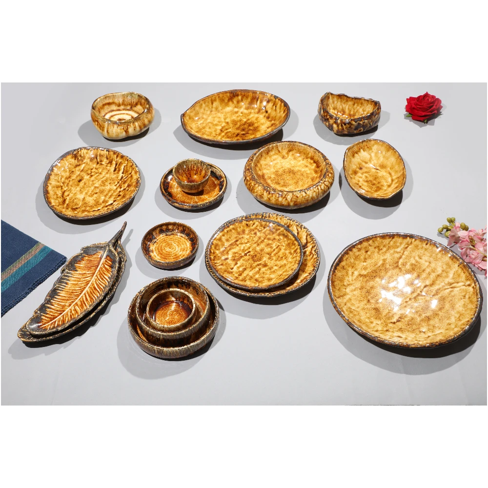A handcrafted ceramic dinnerware and serveware collection featuring deep golden–caramel reactive glaze with warm, glowing textures inspired by fire and earth.