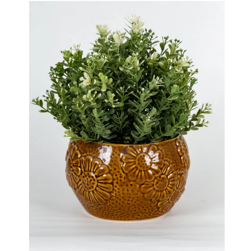 The Golden Petal Embossed Ceramic Planter showcases artisanal craftsmanship through its intricate floral detailing and rich, glossy golden-brown glaze. The embossed petal patterns wrap gracefully around the rounded body, creating depth, texture, and a handcrafted aesthetic that stands out.