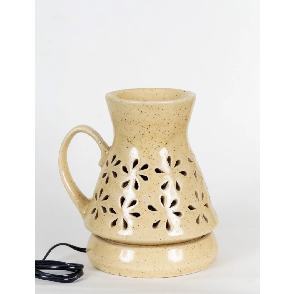 The Golden Sand Floral Ceramic Aroma Oil Burner with Handle is a beautifully designed décor piece that blends functionality with artisanal charm. Crafted in a soothing sand-beige glaze with subtle speckling, this burner showcases intricate floral cut-out patterns that allow gentle light to filter through, creating a calming and cozy atmosphere. The added ceramic handle gives it a unique pitcher-inspired silhouette and makes it easy to move or position.