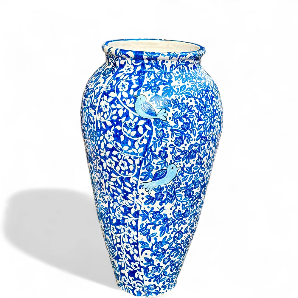 Bring home timeless artistry with our Hand-Painted Blue & White Floral Terracotta Vase, a masterpiece that reflects traditional craftsmanship and elegance. Each vase is meticulously painted by skilled artisans, featuring delicate floral vines and bird motifs inspired by classic Indian and Persian pottery art.
