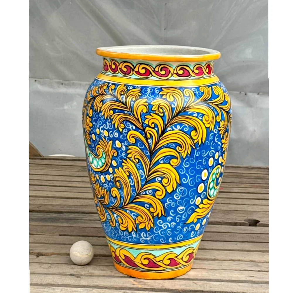 Add a splash of vibrant artistry to your space with our Hand-Painted Italian Majolica Style Ceramic Planter, a masterpiece crafted with intricate detail and rich Mediterranean-inspired patterns. The bold blue base is beautifully complemented by yellow ornamental motifs, red borders, and hand-drawn swirls—creating a striking decorative piece that instantly elevates any setting.