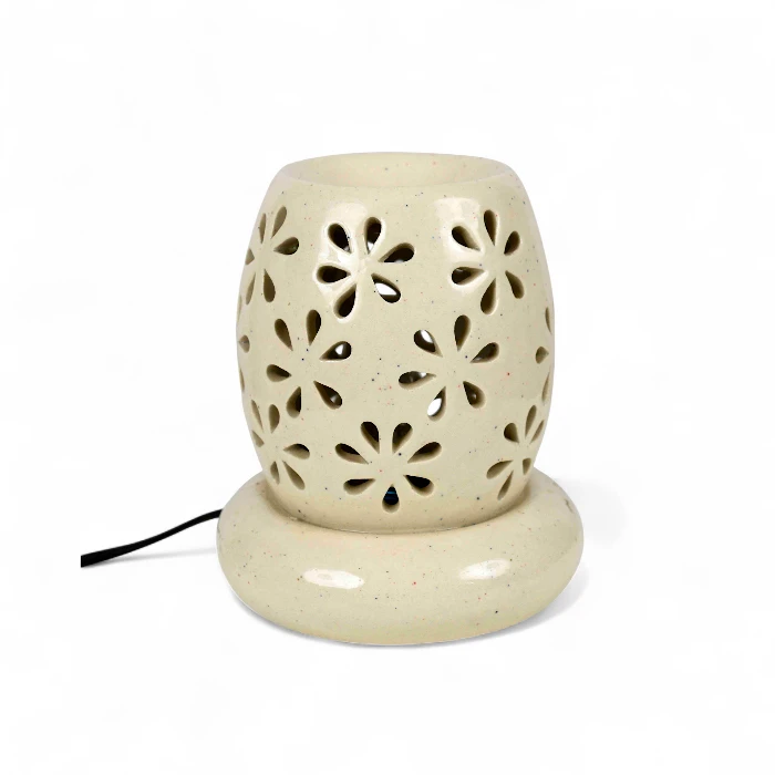 A handcrafted ceramic electric aroma diffuser featuring intricate floral cutwork in a soft natural beige glaze — ideal for modern, earthy interiors.