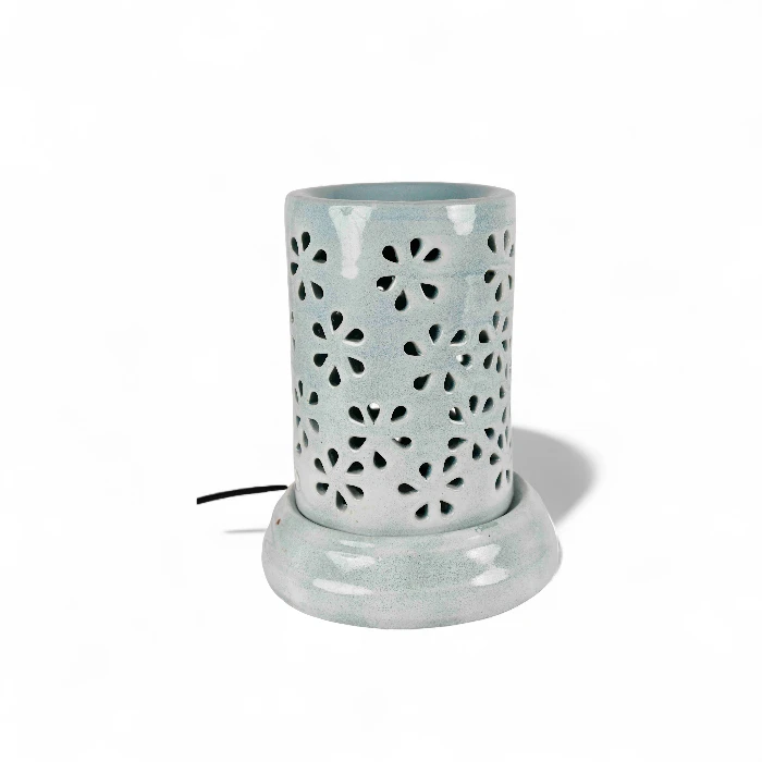 Handcrafted in premium ceramic, this diffuser features a tall cylindrical shape with intricate floral cut patterns that glow beautifully when lit. The smooth soft blue glaze adds a fresh and tranquil charm to any setting.