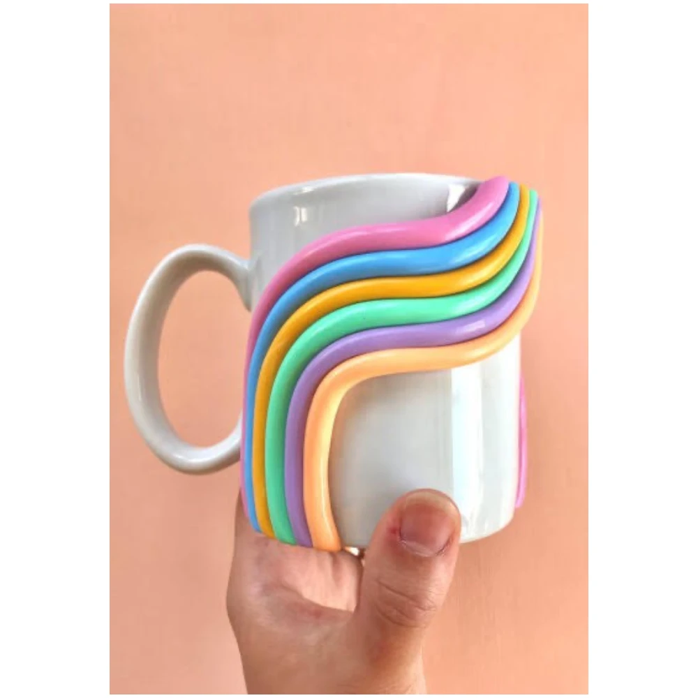 The raised rainbow design wraps beautifully across the mug, creating a unique handcrafted look that stands out while maintaining a modern and playful aesthetic. The smooth ceramic base complements the vibrant colors, making the mug both functional and visually striking.