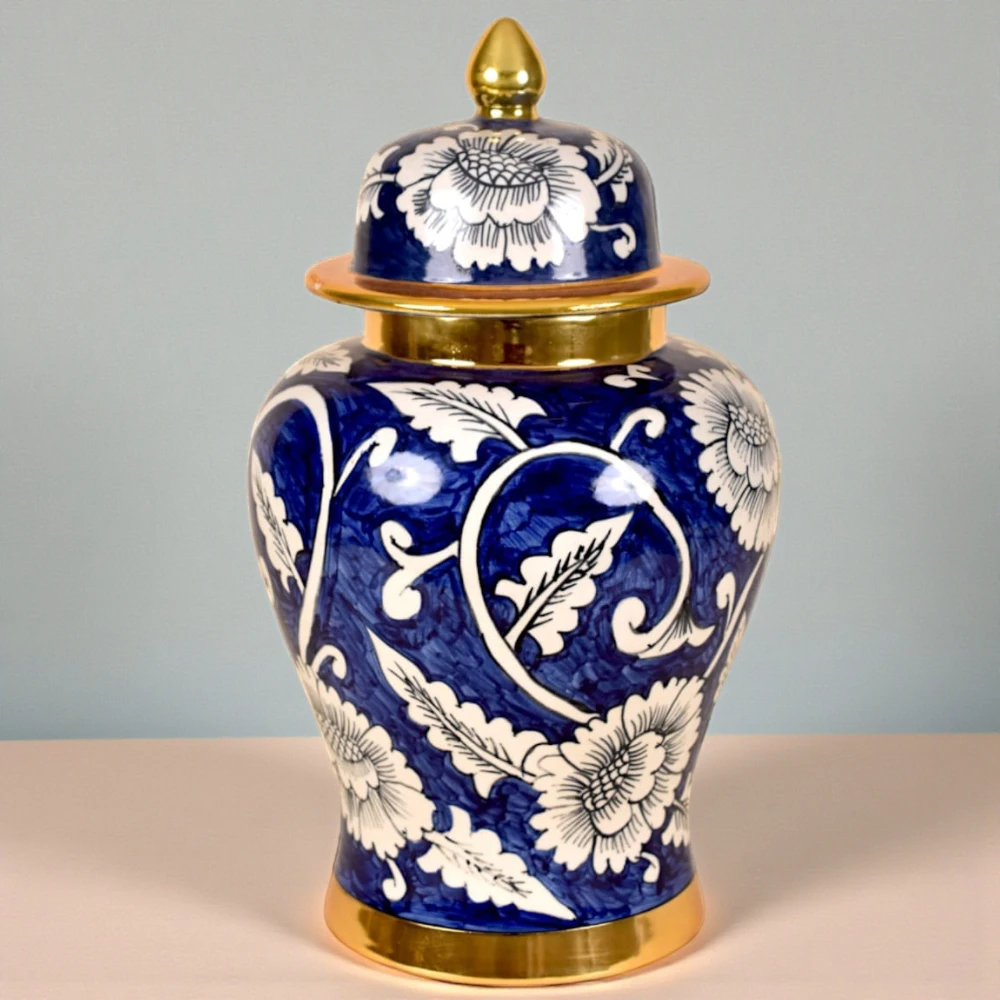 A luxurious blue and white ceramic ginger jar with hand-painted floral motifs.