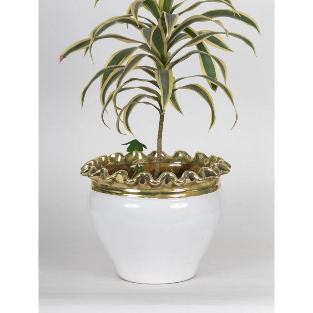 The beautifully sculpted gold ruffled rim adds a regal accent, elevating the planter’s overall aesthetic without overpowering its form. Its gently tapered silhouette provides balance and elegance, making it ideal for showcasing ornamental plants, decorative foliage, or artificial trees.