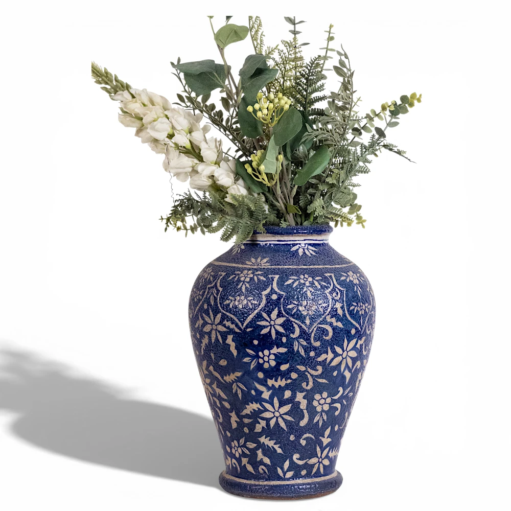 A handcrafted ceramic vase in deep indigo blue, adorned with intricate floral and geometric patterns for a timeless, artistic look.