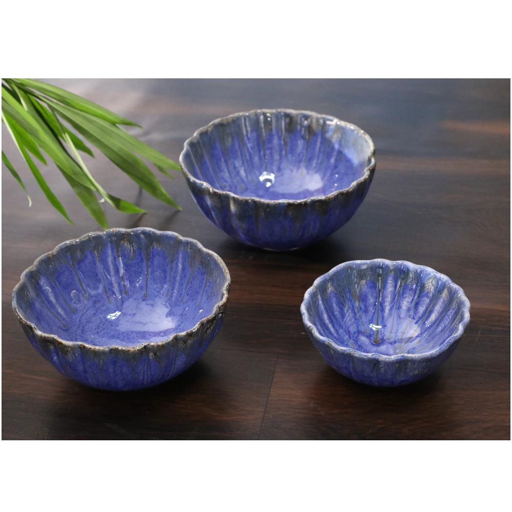 The Indigo Petal Bowls – Set of 3 are inspired by organic floral forms and traditional high-fire glazing techniques. Each bowl is individually handcrafted with softly fluted, petal-like contours that create depth, movement, and a tactile surface.