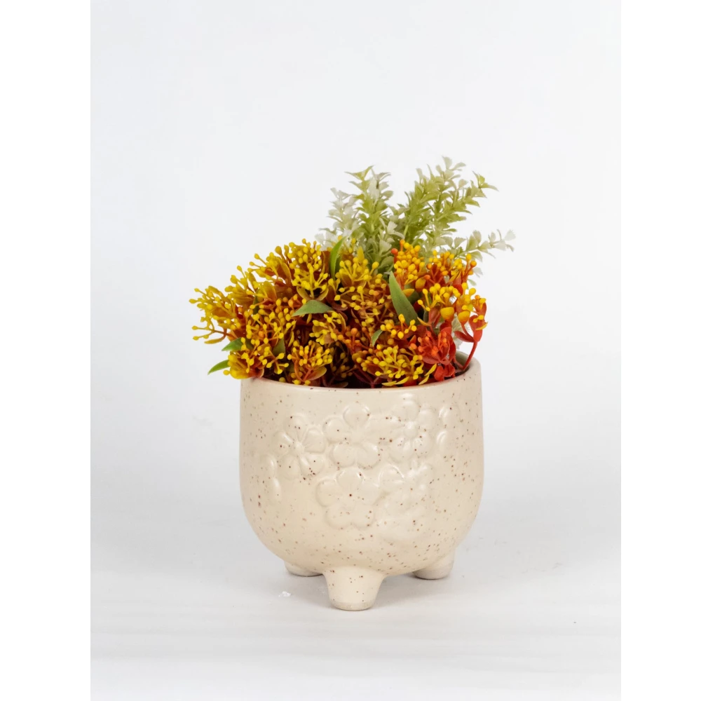A handcrafted ceramic planter in a soft ivory glaze with delicate speckling and subtle floral embossing, elevated on minimal feet for a refined look.