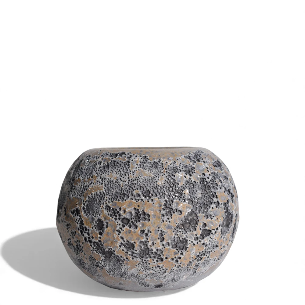 The LavaStone Bubble-Texture Round Planter is a striking fusion of natural inspiration and handcrafted artistry. Its rounded silhouette is coated in a dramatic bubbled reactive glaze, creating a surface that resembles cooled volcanic stone. The mix of charcoal grey and warm earthy undertones adds depth and character, making each piece completely unique.