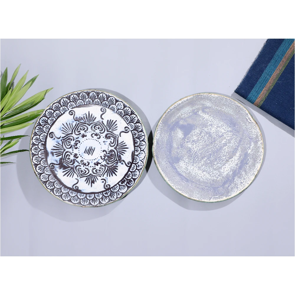 The Luna Imprint Dinner Plate Set brings together intricate artistry and modern restraint. Handcrafted in ceramic, one plate features a delicately illustrated radial motif inspired by traditional hand-drawn patterns, while the companion plate showcases a serene, pearlescent glaze with subtle texture and depth.