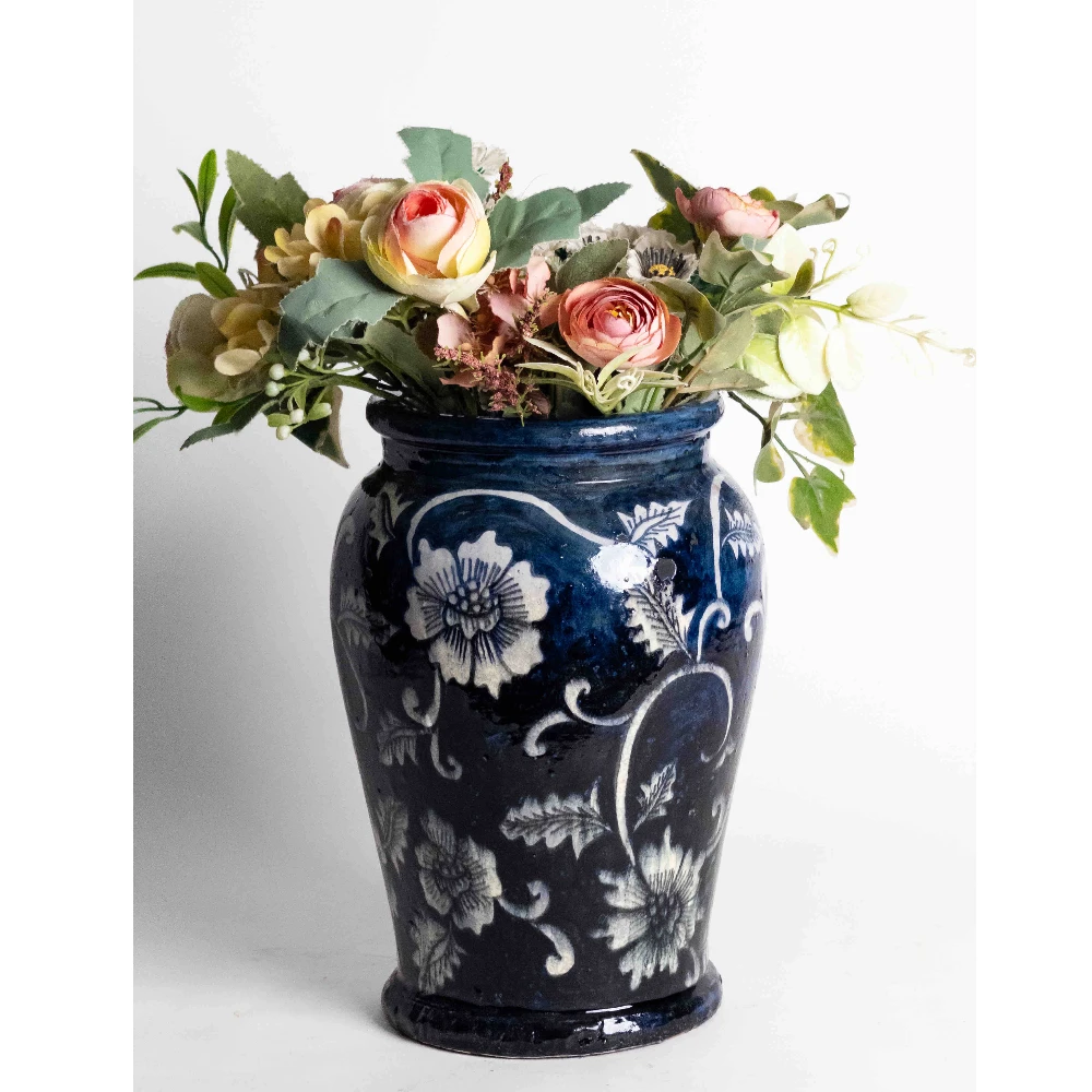 The Midnight Bloom Hand-Painted Ceramic Vase is a statement of classic elegance and artisanal mastery. Handcrafted and glazed in a rich, inky blue tone, this vase is adorned with delicately hand-painted florals in soft ivory hues, creating a striking contrast that feels both bold and refined.