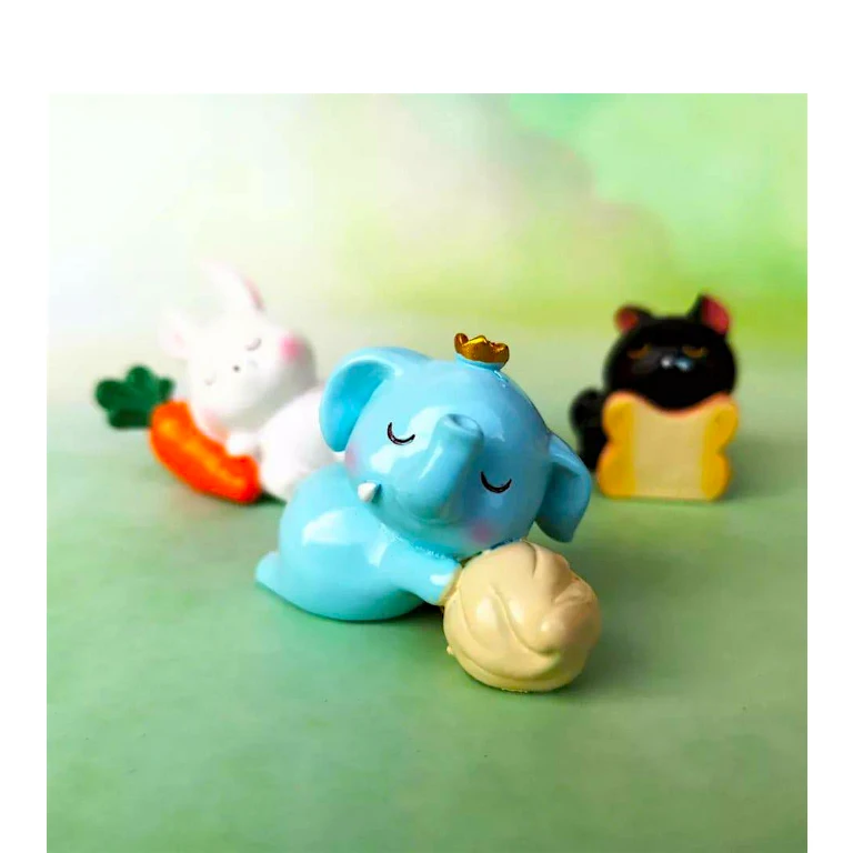 Each piece is handcrafted and hand-painted by skilled artisans, featuring a sleepy blue elephant with a crown, a white bunny hugging a carrot, and a black cat with a toast.