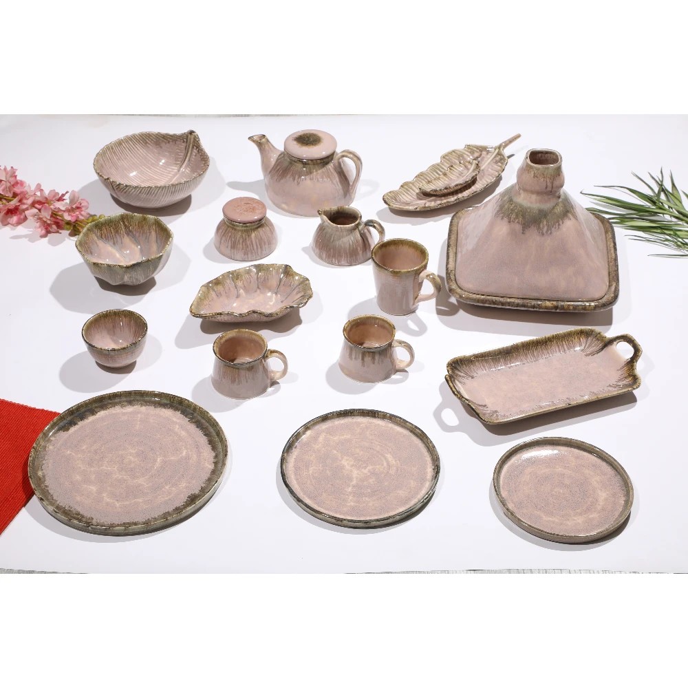 A serene handcrafted ceramic collection featuring soft blush tones with mossy sage reactive edges, inspired by nature’s quiet elegance.