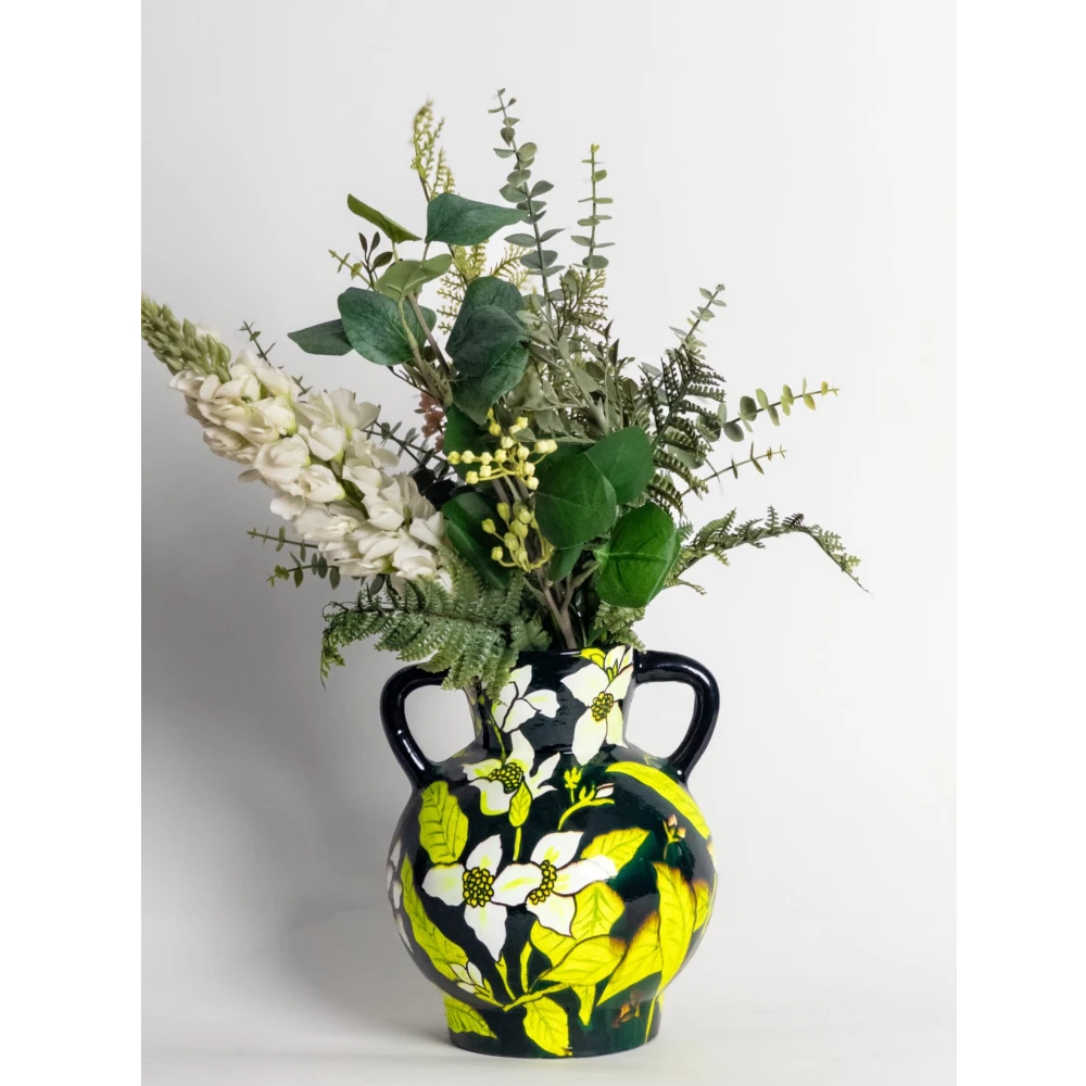 Adorned with large white blossoms and vibrant green-yellow leaves, the artwork creates a stunning contrast against the dark background. The rounded body and twin side handles add a classic amphora-inspired silhouette, blending heritage charm with contemporary styling.