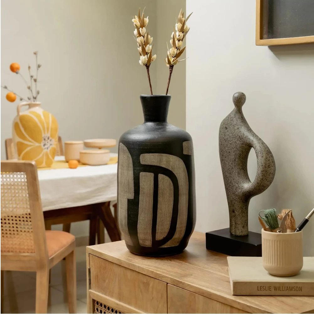 Its softly curved silhouette and textured detailing create visual depth, making it a statement piece whether styled with dried botanicals or displayed as a standalone sculpture. The contrast between the dark body and muted earthy accents brings warmth while maintaining a minimalist, modern aesthetic.