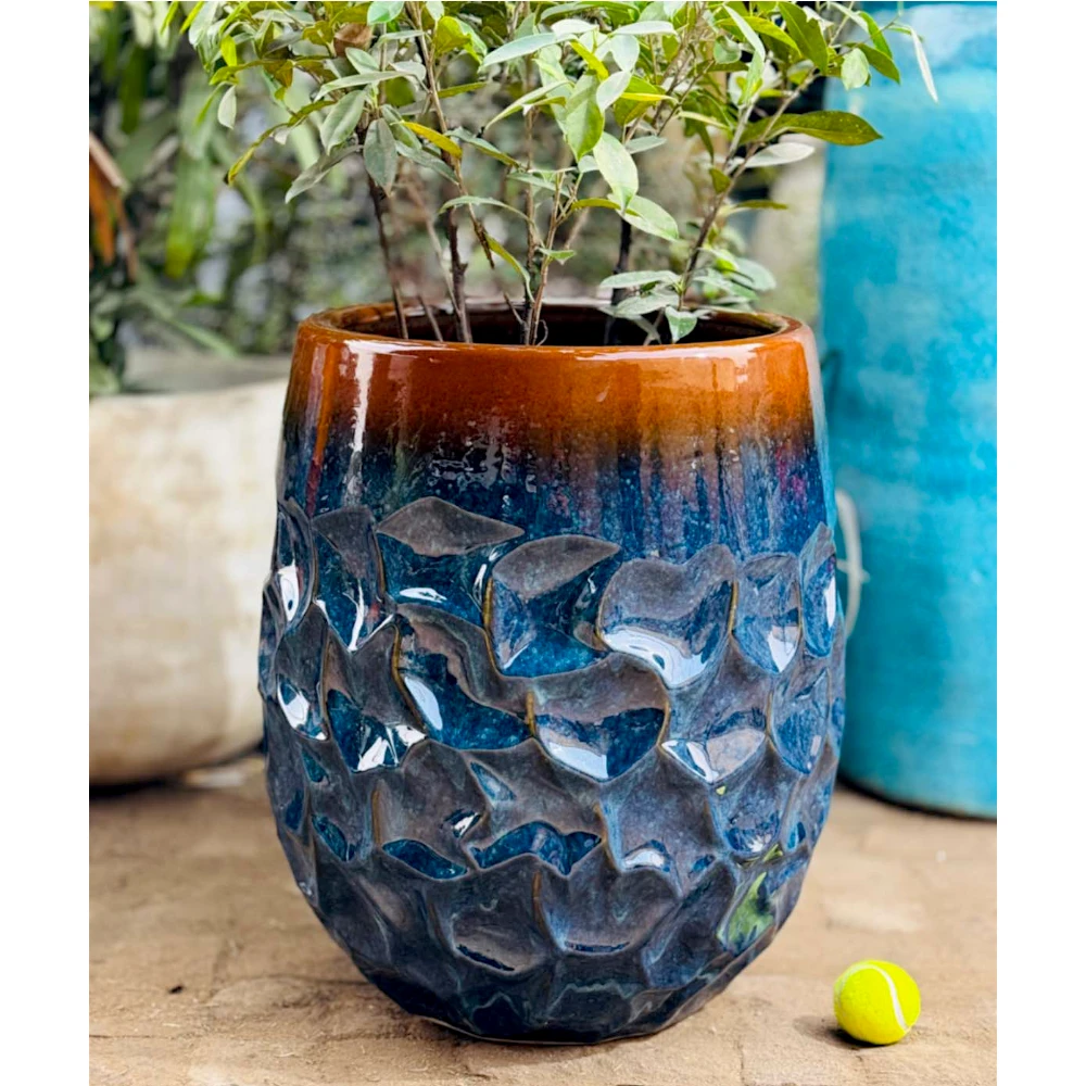 Each piece reflects handcrafted character, making it ideal for showcasing leafy plants, shrubs, or decorative greens. Its bold texture and rich color palette add depth and warmth to balconies, living rooms, patios, and garden corners.