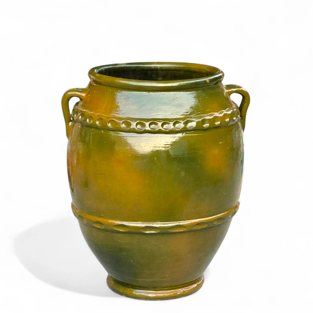 Add a touch of timeless elegance to your décor with our Olive Green Glazed Ceramic Planter, beautifully handcrafted and finished with a rich, glossy olive glaze. This pot features artisan-style ring handles and detailed beaded bands, giving it a classic Mediterranean vintage charm that stands out as a striking décor piece.