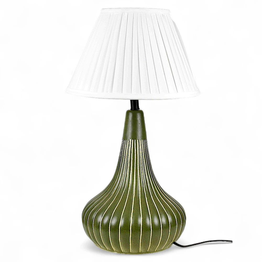 Paired with a crisp white pleated lampshade, it casts a soothing, diffused glow — perfect for cozy evenings or refined interior accents. The natural green hue brings a grounding presence, making it a versatile choice for both modern and traditional décor themes.