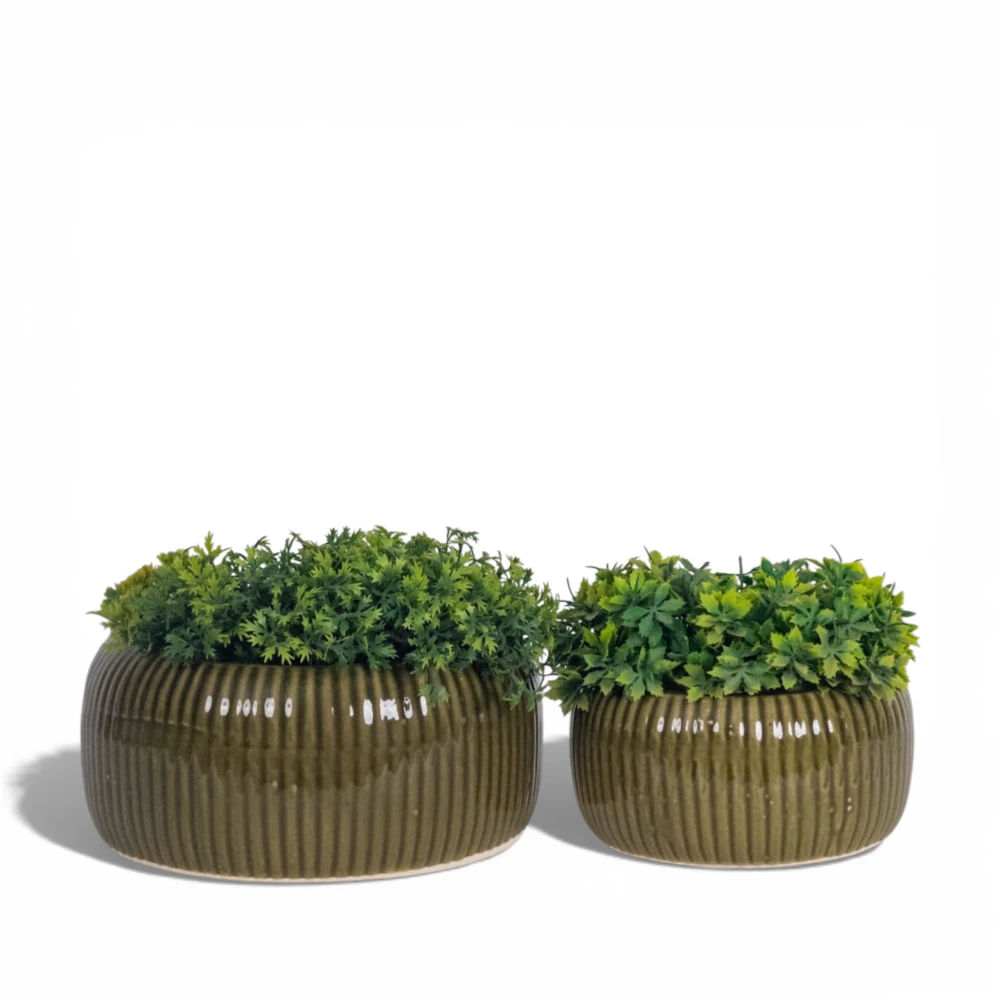 This premium ceramic planter features a rounded bowl silhouette enhanced with vertical ribbed detailing. The glossy olive glaze reflects light beautifully, giving it a warm, sophisticated appearance that complements both contemporary and rustic interiors.