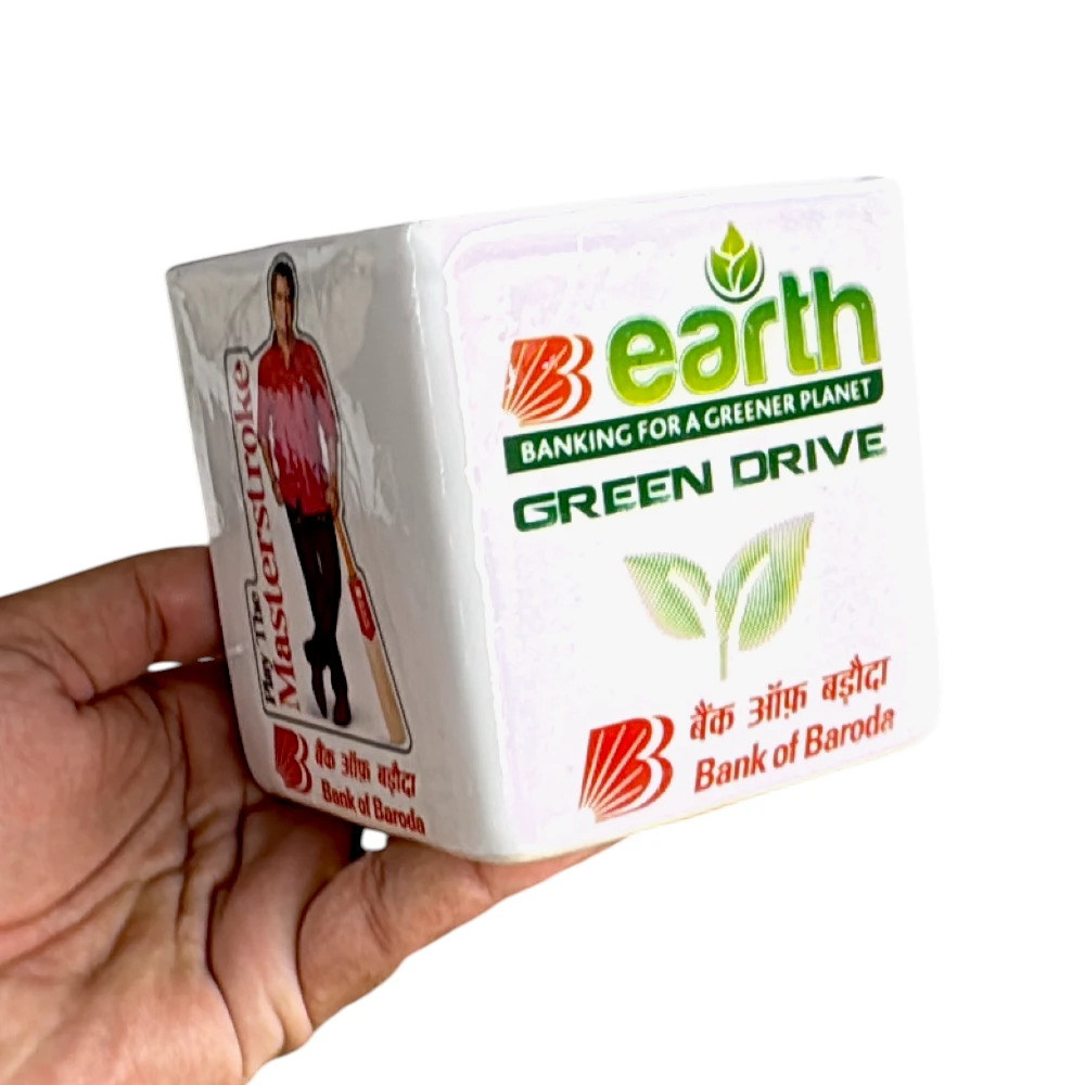 This premium ceramic planter is printed with the Bank of Baroda “Earth Green Drive” campaign logo, making it an excellent example of how businesses can combine brand visibility with eco-conscious gifting. Crafted from durable ceramic with a glossy white finish, the planter is ideal for small indoor plants like succulents, money plants, or lucky bamboo.