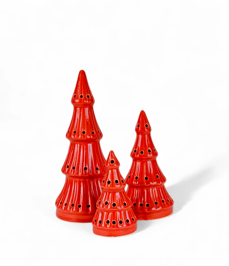 Celebrate the season in style with the Red Ceramic Christmas Tree Set – Festive Glow Collection from DNF Ceramics. This charming set includes three handcrafted ceramic trees in varying heights, featuring a radiant red glaze and intricate cutout detailing that allows light to shimmer through when placed near candles or string lights.