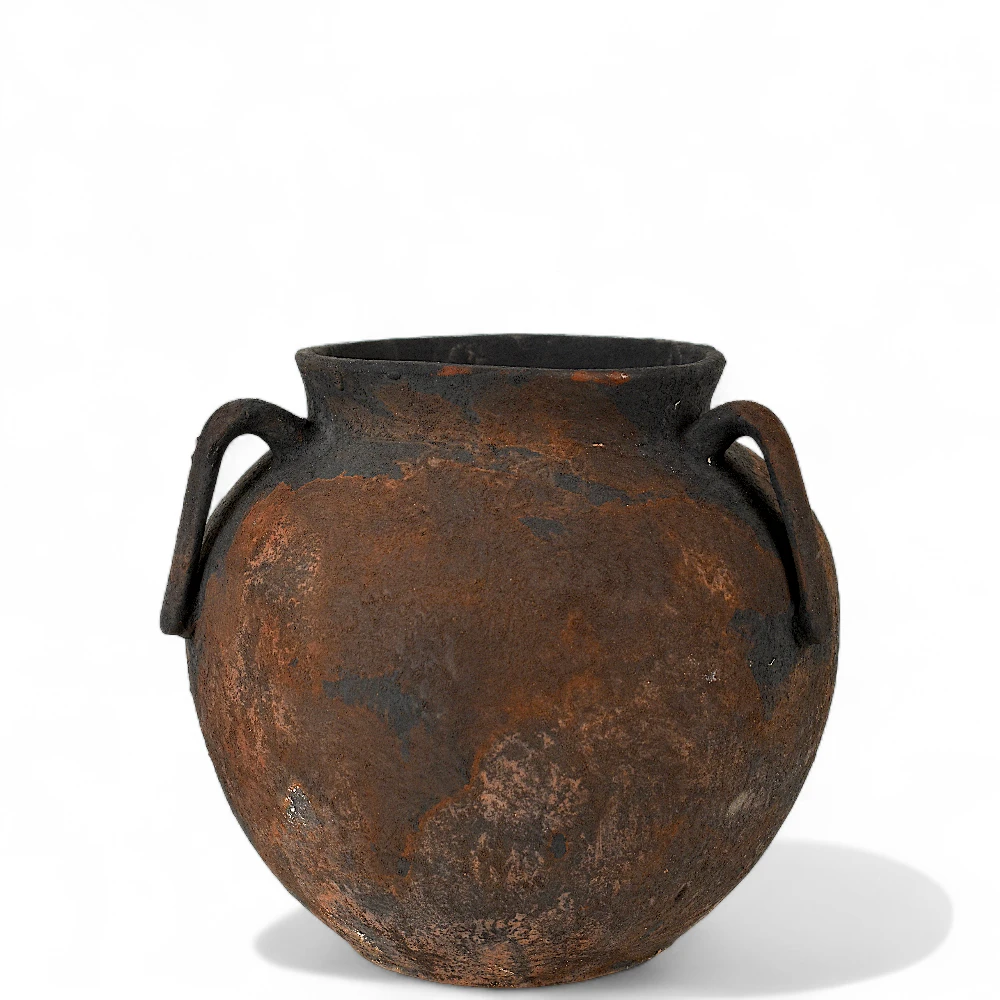 The pot’s dual handles and round silhouette evoke traditional earthenware used in ancient homes, making it a true collector’s accent for modern rustic interiors. Perfect for displaying dried botanicals or as a standalone sculptural statement, it brings a warm, grounded energy to any setting.