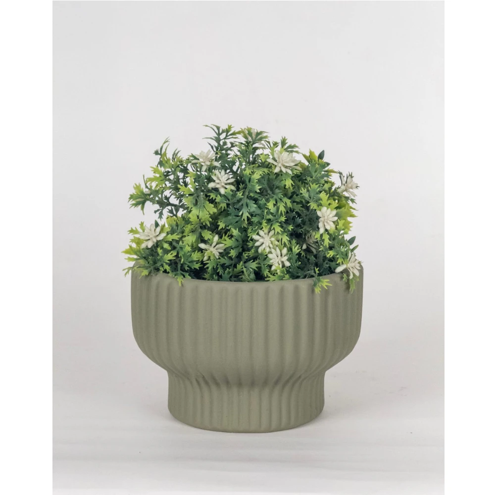The Sage Ripple Ceramic Planter embodies understated elegance through clean lines and subtle texture. Crafted from high-quality ceramic, this planter features a soothing sage-green matte finish complemented by evenly spaced vertical ribbing that adds depth without visual clutter.