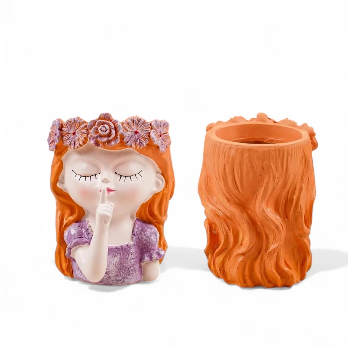 Handcrafted with fine ceramic details, this planter features a tranquil girl design with flowing hair, floral headband, and a soft “shh” gesture — a reminder to pause and find calm in your day.