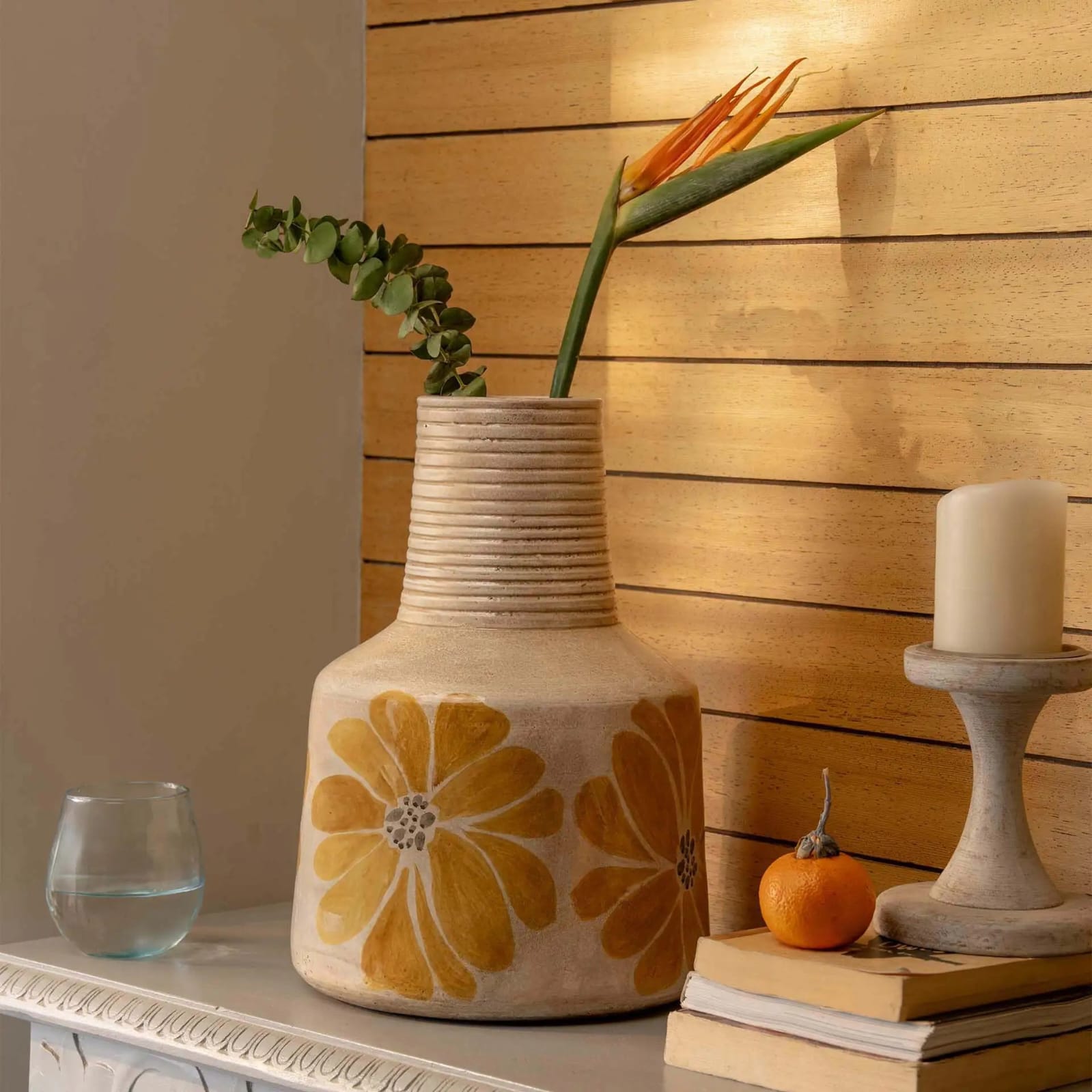 The Solaria Bloom Ribbed Ceramic Vase blends soft sculptural form with hand-painted charm. Crafted by hand and finished in a warm ivory base, the vase is adorned with expressive floral motifs in sunlit yellow tones, creating a gentle yet striking visual presence.