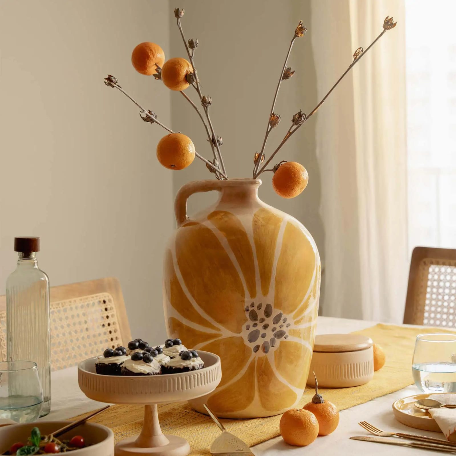 Its gently rounded body, elegant handle, and organic brushwork give the piece a timeless, artisanal presence. Designed to work beautifully as both a functional vase and a standalone décor accent, Solaria Petal adds a welcoming glow to dining tables, consoles, and styled shelves.