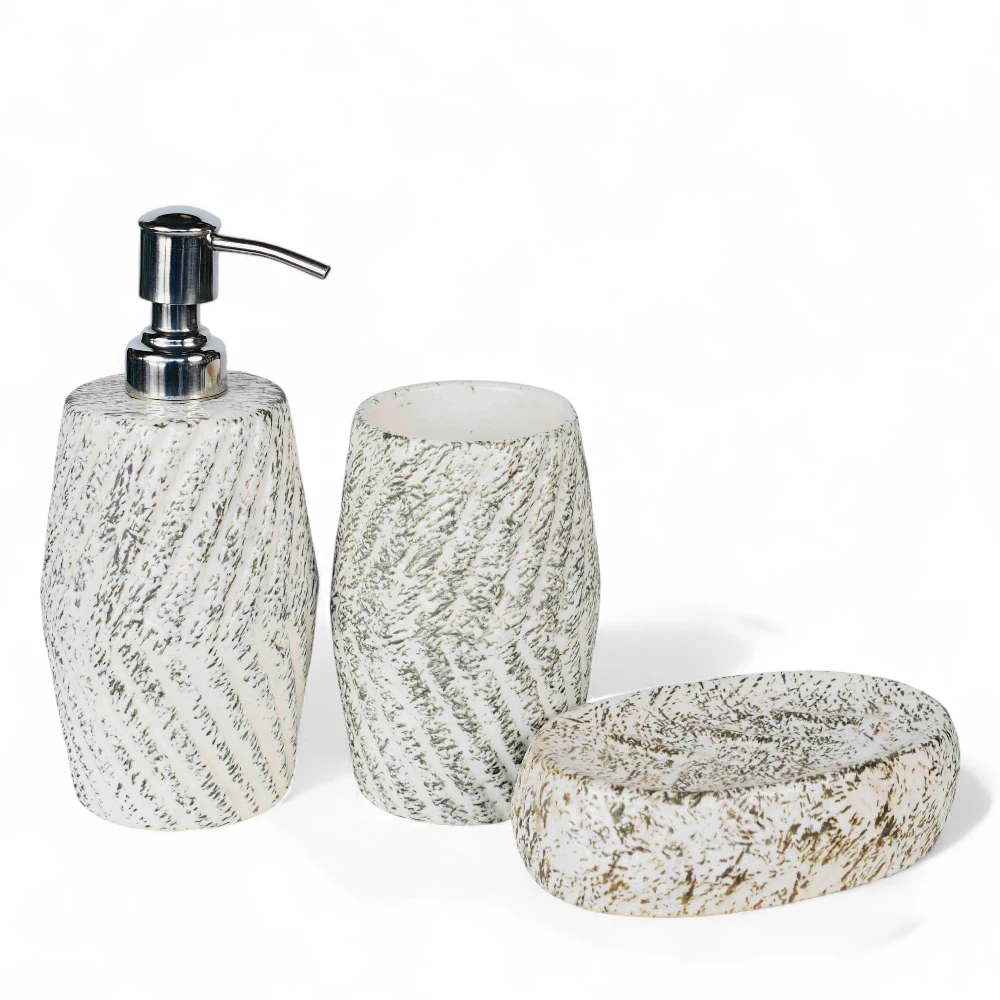 Featuring an organic texture with diagonal brush detailing in soft earthy tones, this 3-piece set adds warmth and sophistication to any bathroom interior.