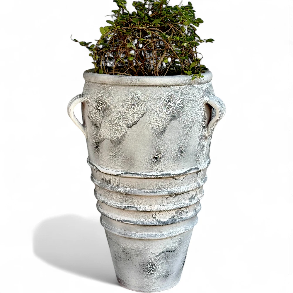 Whether styled as a statement planter for greenery or a standalone décor piece, its tall form and dual handles add an architectural balance to both contemporary and vintage interiors.